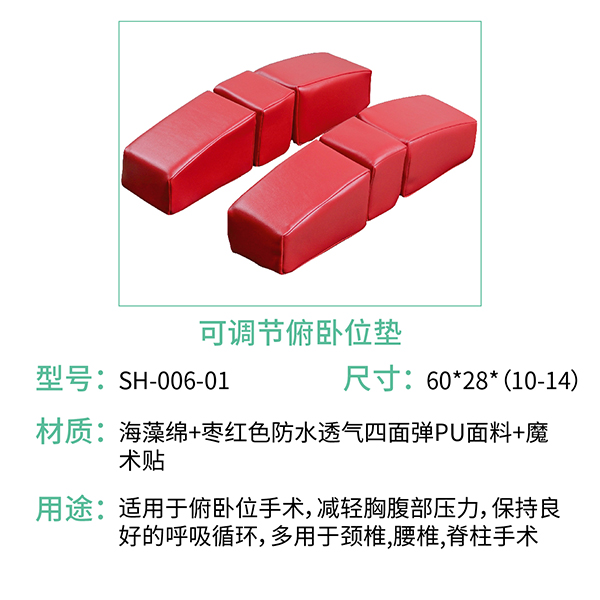 俯臥位墊主要用于手術(shù)過程中患者的俯臥體位支撐。在進行某些手術(shù)時,如脊柱手術(shù)、后路手術(shù)等,需要將患者置于俯臥位,此時俯臥位墊能夠提供穩(wěn)定的支撐,確保手術(shù)過程中的體位安全。