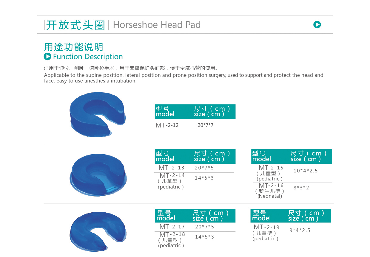 【產(chǎn)品用途】:適用于仰位、側(cè)臥、俯臥位手術(shù),用于支撐保護(hù)頭面部,便于全麻插管的使用。
